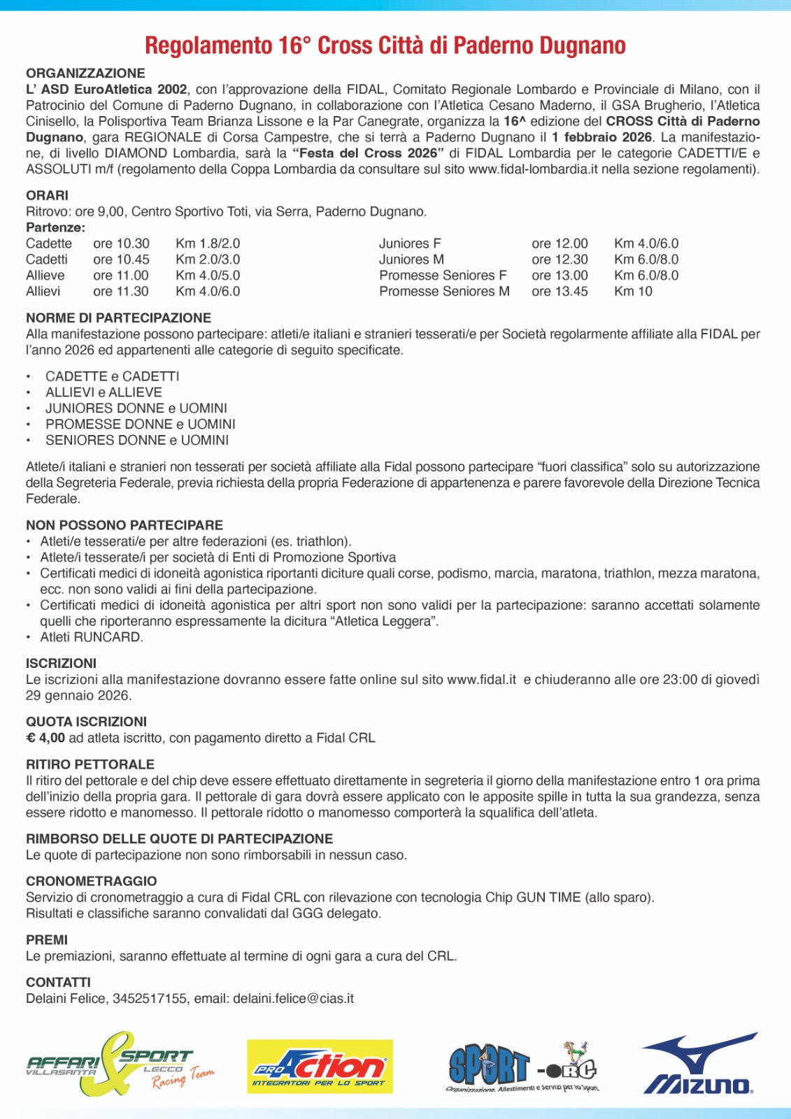 Ora un week end di riposo prima del Cross organizzato da EuroAtletica 2002 a Paderno Dugnano il 1° febbraio, quest' anno si disputeranno a casa nostra, al parco Toti i Campionati Regionali di Cross!