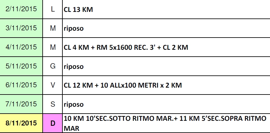 Per esempio se le mie ripetute medie sono nella cassella "3,25 - 3,35" la prima settimana è consigliato farle a 3,35 e nelle settimane successive raggiungere graduatamente 3,25.